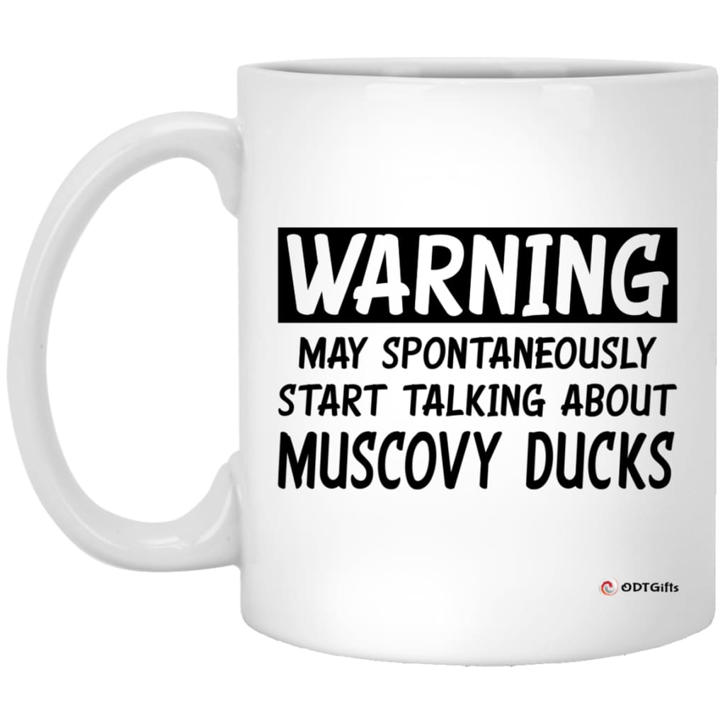 Funny Muscovy Duck Mug Warning May Spontaneously Start Talking About Muscovy Ducks Coffee Cup 11oz White High quality ceramic mug Dishwasher safe Microwave safe White gloss 11 oz Decorated with full wrap dye sublimation