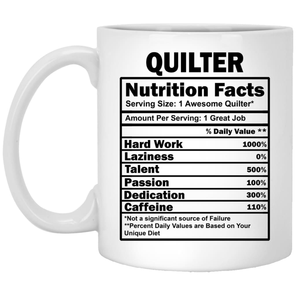 Funny Quilter Nutritional Facts Coffee Mug 11oz White High quality ceramic mug Dishwasher safe Microwave safe White gloss 11 oz Decorated with full wrap dye sublimation