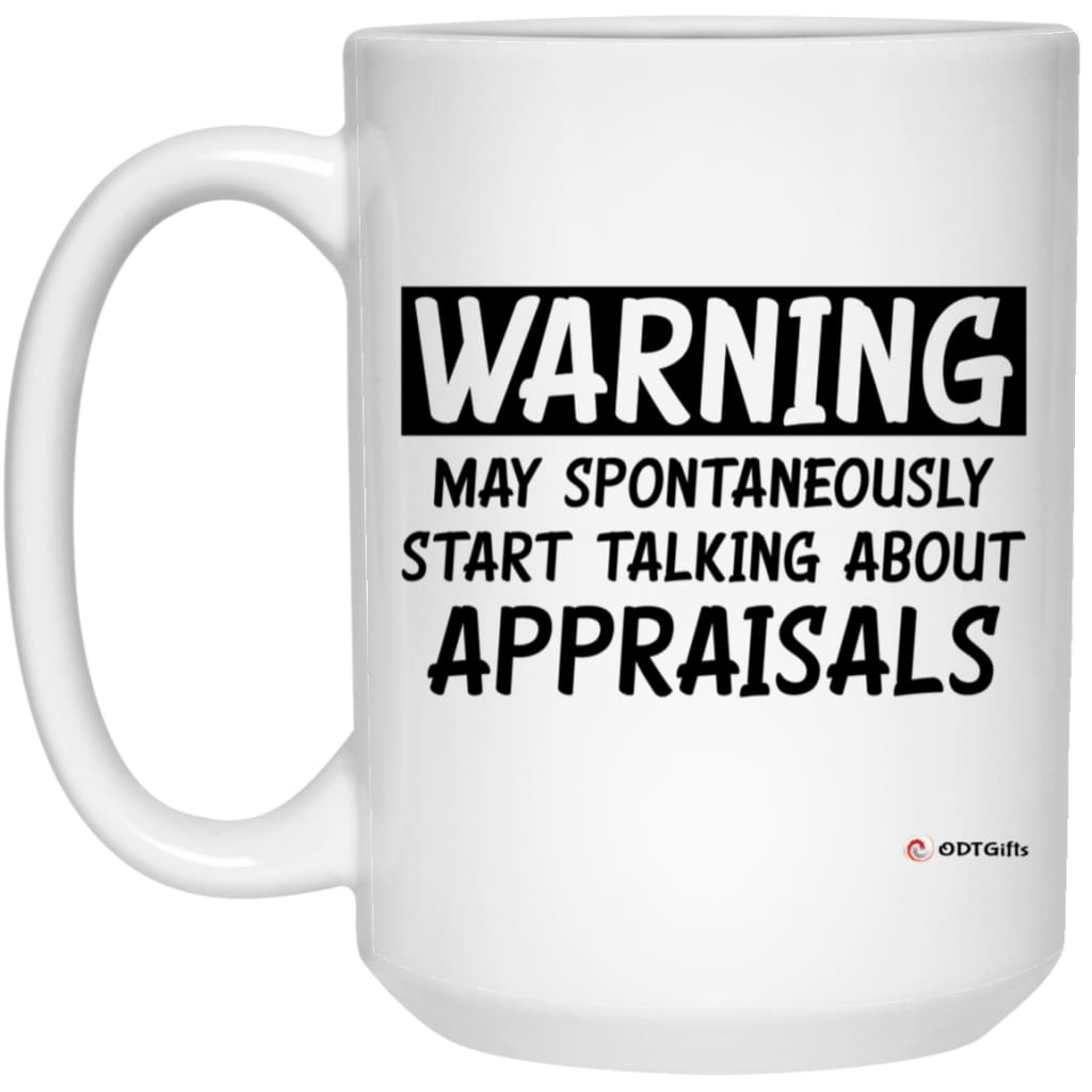 Funny Appraiser Mug Gift Warning May Spontaneously Start Talking About Appraisals Coffee Cup 15oz White High quality ceramic mug Dishwasher safe Microwave safe White gloss 15 oz Decorated with full wrap dye sublimation