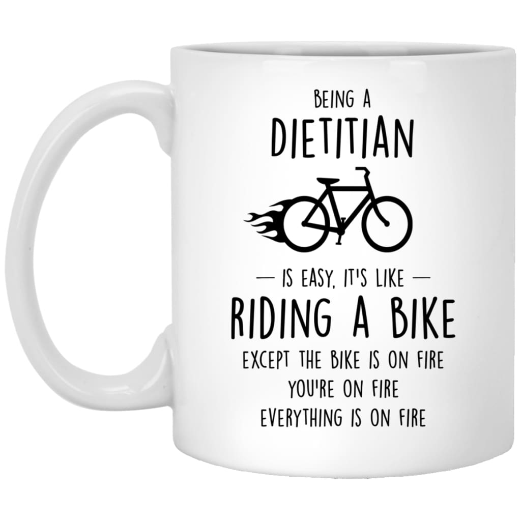 Funny Being A Dietitian Is Easy It's Like Riding A Bike Except Coffee Mug 11oz White High quality ceramic mug Dishwasher safe Microwave safe White gloss 11 oz Decorated with full wrap dye sublimation