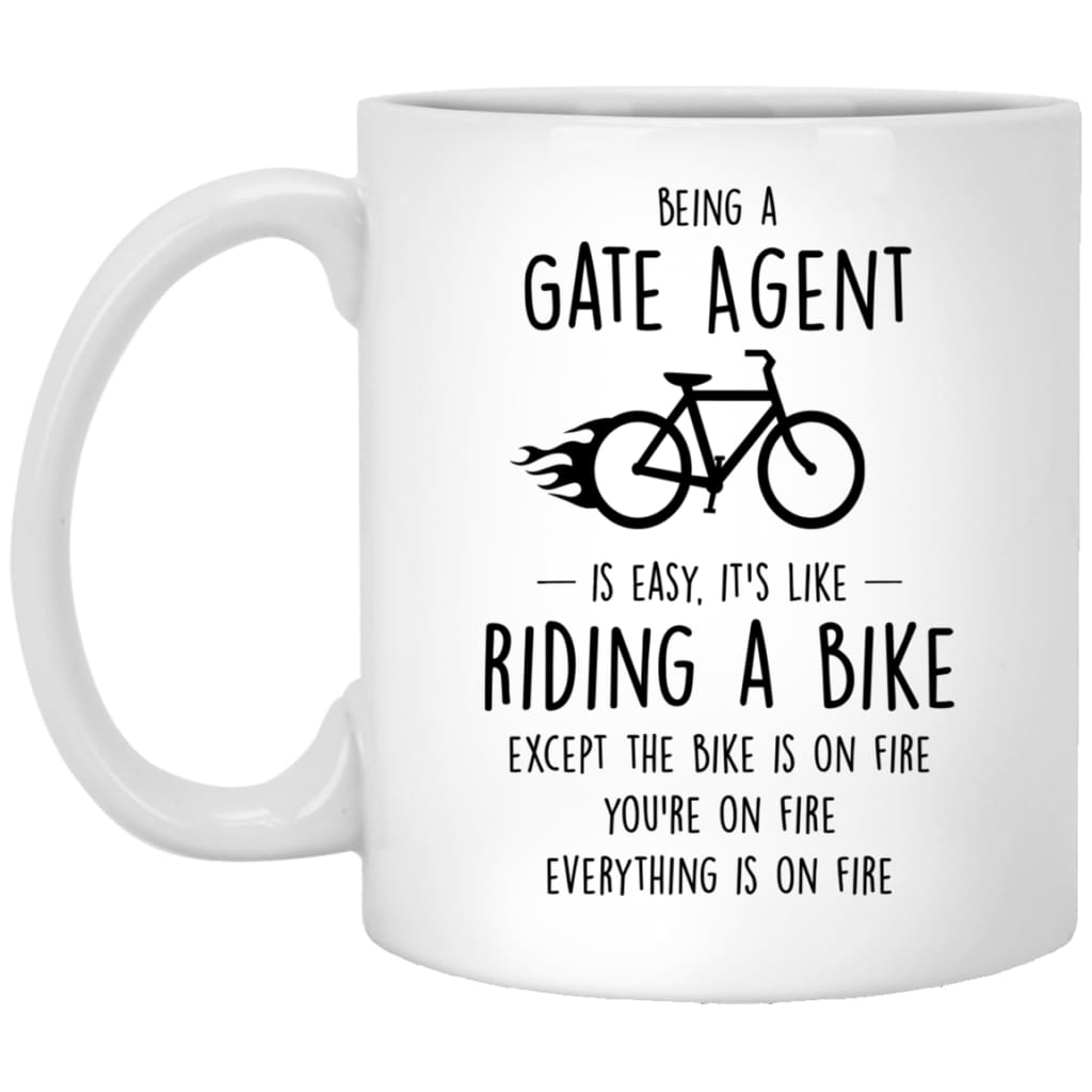 Funny Being A Gate Agent Is Easy It's Like Riding A Bike Except Coffee Mug 11oz White High quality ceramic mug Dishwasher safe Microwave safe White gloss 11 oz Decorated with full wrap dye sublimation
