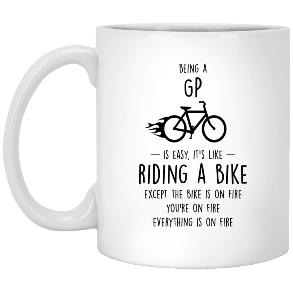 Funny Being A GP Is Easy It's Like Riding A Bike Except Coffee Mug 11oz White High quality ceramic mug Dishwasher safe Microwave safe White gloss 11 oz Decorated with full wrap dye sublimation