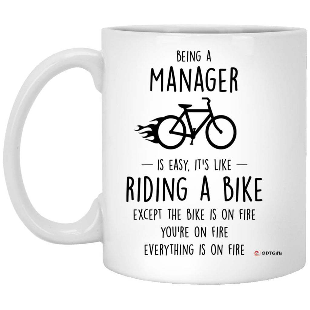 Funny Being A Manager Is Easy It's Like Riding A Bike Except Coffee Mug 11oz White High quality ceramic mug Dishwasher safe Microwave safe White gloss 11 oz Decorated with full wrap dye sublimation