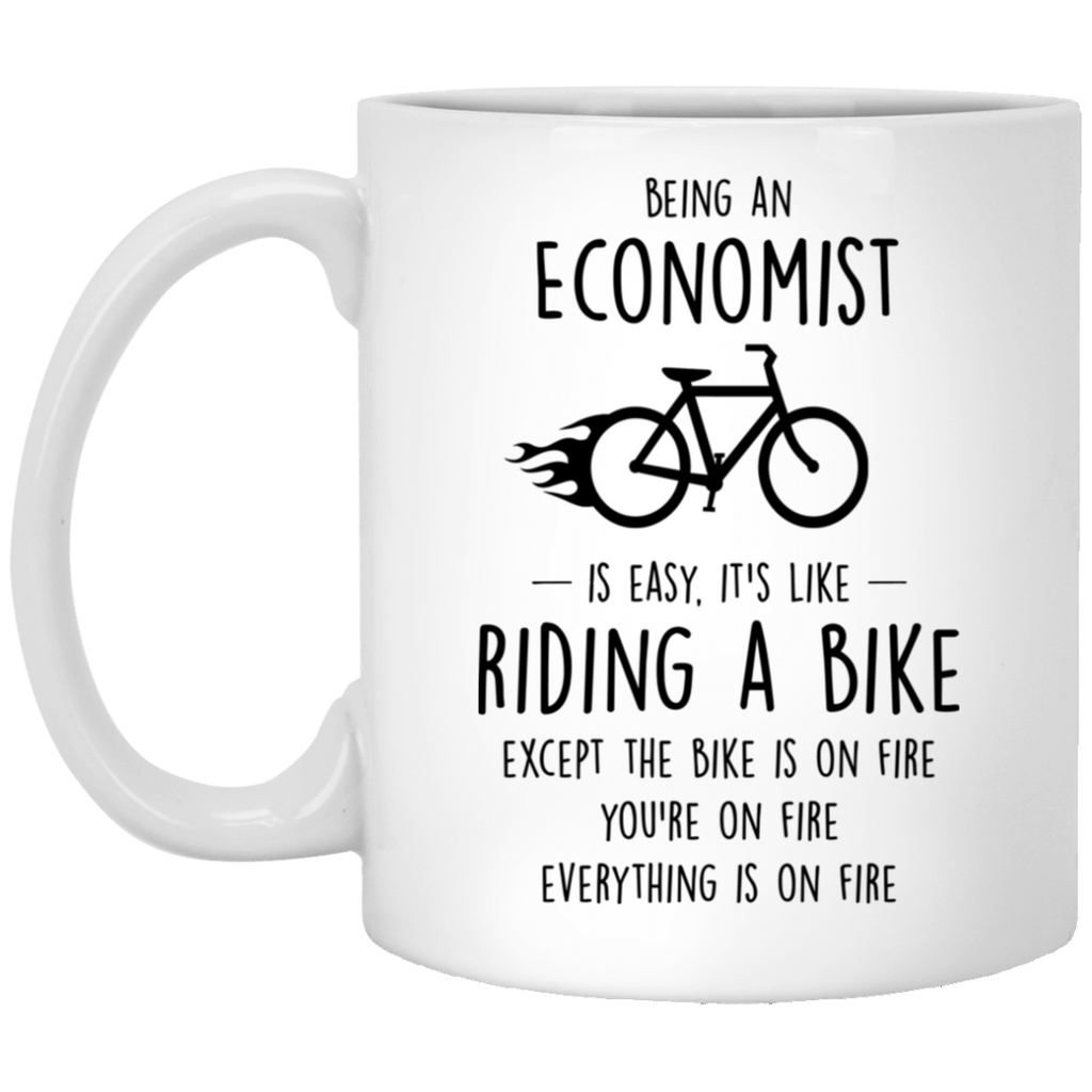 Funny Being An Economist Is Easy It's Like Riding A Bike Except Coffee Mug 11oz White High quality ceramic mug Dishwasher safe Microwave safe White gloss 11 oz Decorated with full wrap dye sublimation