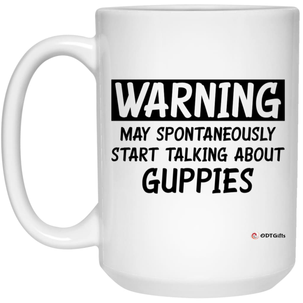 Funny Guppies Mug Warning May Spontaneously Start Talking About Guppies Coffee Cup 15oz White  High quality ceramic mug Dishwasher safe Microwave safe White gloss 15 oz Decorated with full wrap dye sublimation