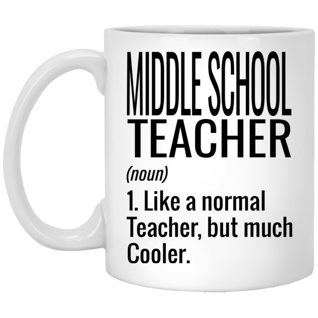 Funny Middle School Teacher Mug Like A Normal Teacher But Much Cooler Coffee Cup 11oz White High quality ceramic mug Dishwasher safe Microwave safe White gloss 11 oz Decorated with full wrap dye sublimation