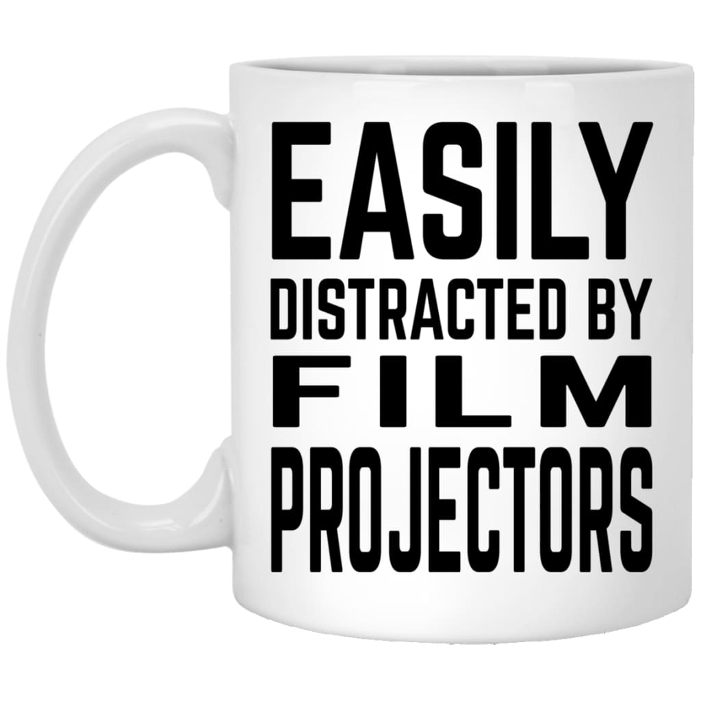 Funny Mug Gift Easily Distracted By Film Projectors Coffee Cup 11oz White High quality ceramic mug Dishwasher safe Microwave safe White gloss 11 oz Decorated with full wrap dye sublimation