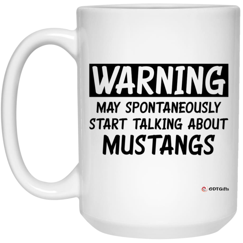 Funny Mustang Mug Warning May Spontaneously Start Talking About Mustangs Coffee Cup 15oz White High quality ceramic mug Dishwasher safe Microwave safe White gloss 15 oz Decorated with full wrap dye sublimation