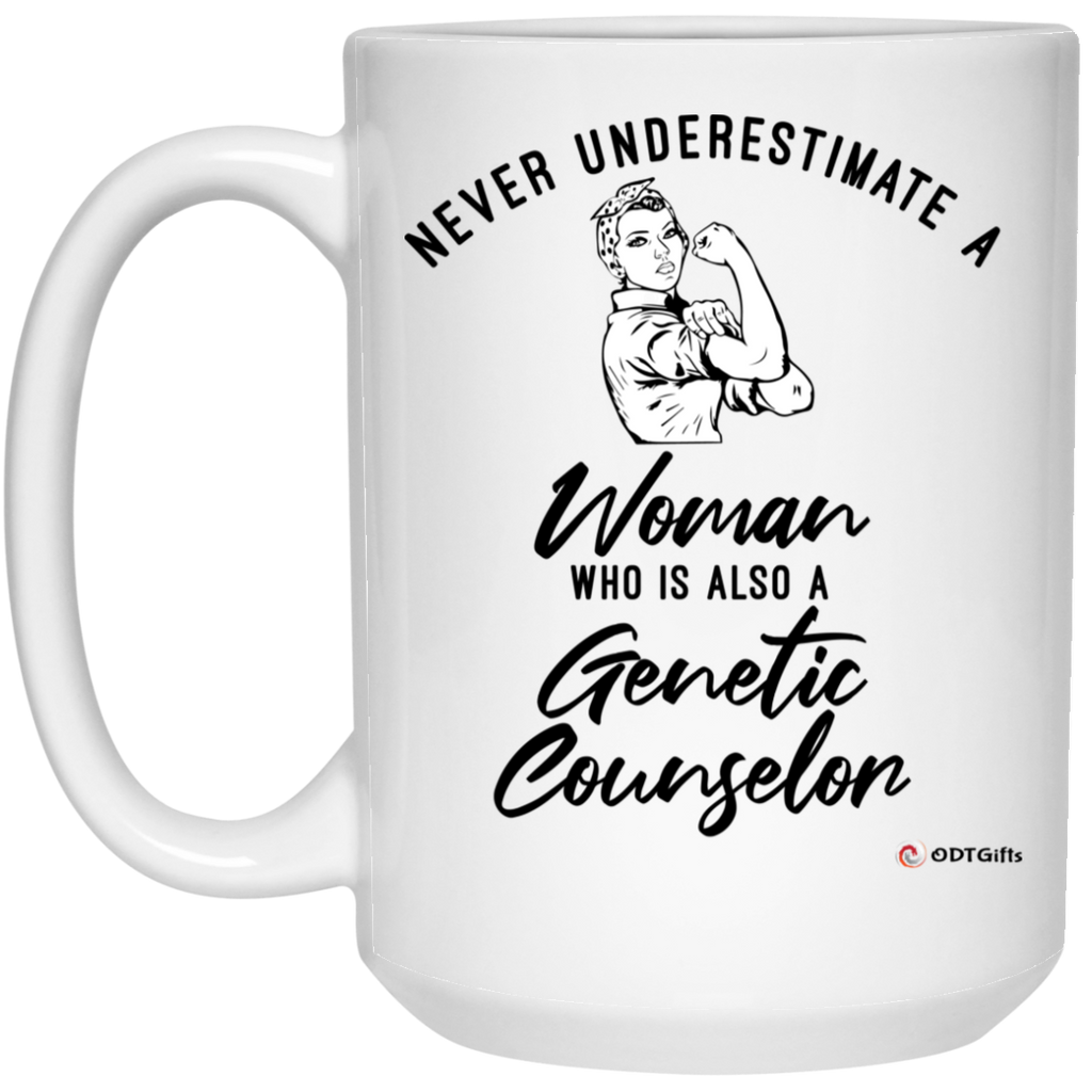 Genetic Counselor Mug Never Underestimate A Woman Who Is Also A Genetic Counselor Coffee Cup 15oz White High quality 15oz white gloss ceramic mug Top to bottom full wrap decoration Microwave & Dishwasher safe ORCA Coating™...
