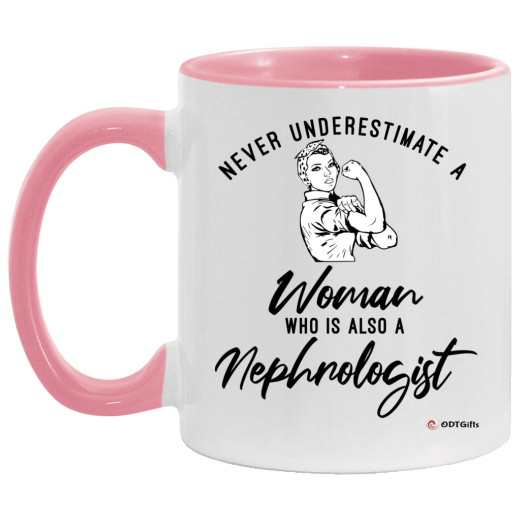 Nephrologist Mug Never Underestimate A Woman Who Is Also A Nephrologist Coffee Cup Two Tone Pink 11oz High quality ceramic mug with two-tone rim, interior, & handle Top to bottom full wrap decoration Dishwasher & Microwave...