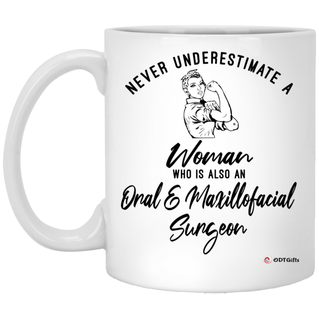 Oral Maxillofacial Surgeon Mug Never Underestimate A Woman Who Is Also An Oral Maxillofacial Surgeon Coffee Cup 11oz White High quality ceramic mug Dishwasher safe Microwave safe White gloss 11 oz Decorated with full wrap dye...