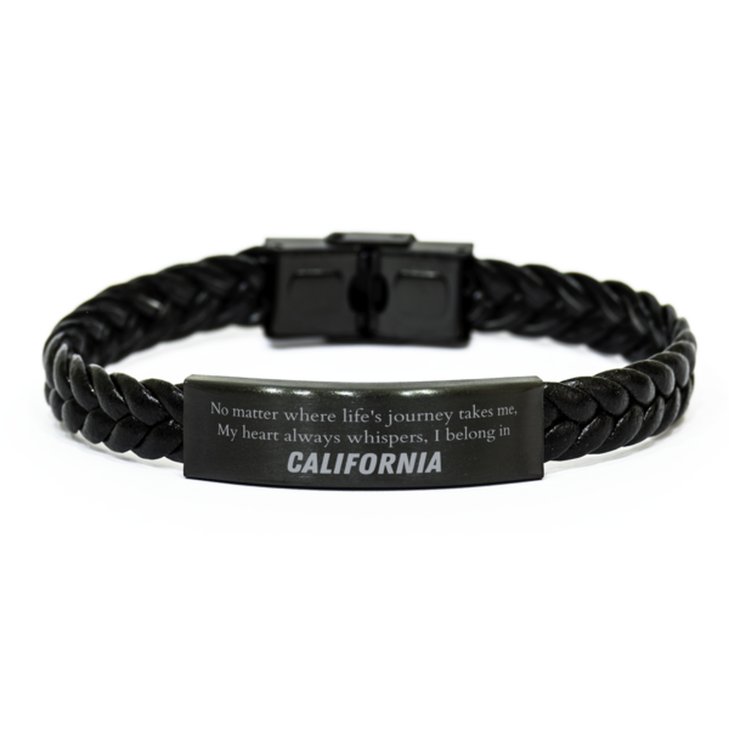 California State Gifts, No matter where life's journey takes me, my heart always whispers, I belong in California, Proud California Braided Leather Bracelet Birthday Christmas For Men, Women, Friends