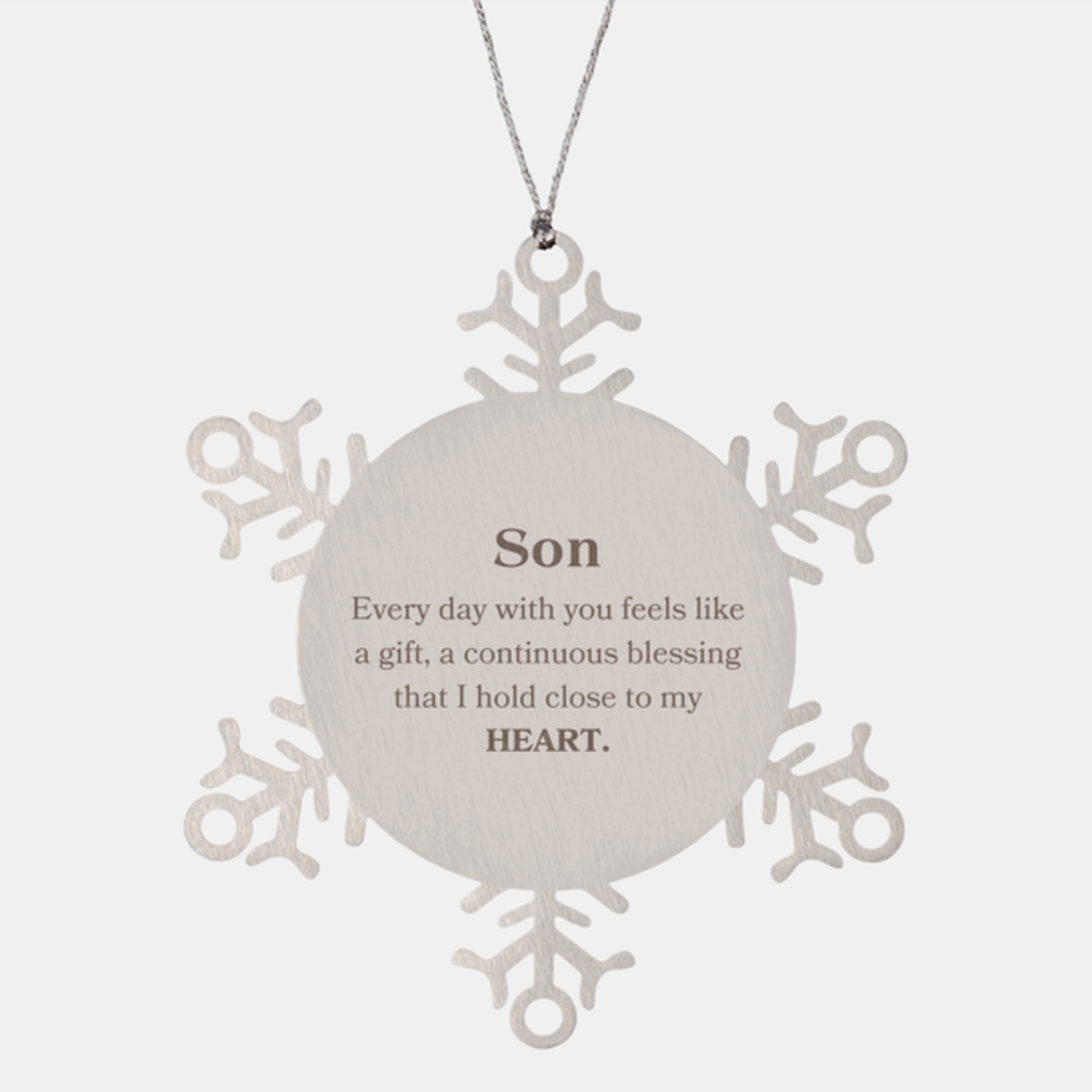 Drape this exquisite Son Snowflake Ornament on your tree and watch as it shimmers and sparkles, creating a magical ambiance in your home. Made from high-quality stainless steel, it's not only a symbol of beauty but also durability. Even in the unfortunate event of a fall from the tree, it remains shatterproof, ensuring that your treasured ornament will last for generations.
