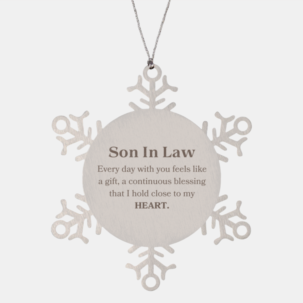 Drape this exquisite Son In Law Snowflake Ornament on your tree and watch as it shimmers and sparkles, creating a magical ambiance in your home. Made from high-quality stainless steel, it's not only a symbol of beauty but also durability. Even in the unfortunate event of a fall from the tree, it remains shatterproof, ensuring that your treasured ornament will last for generations.