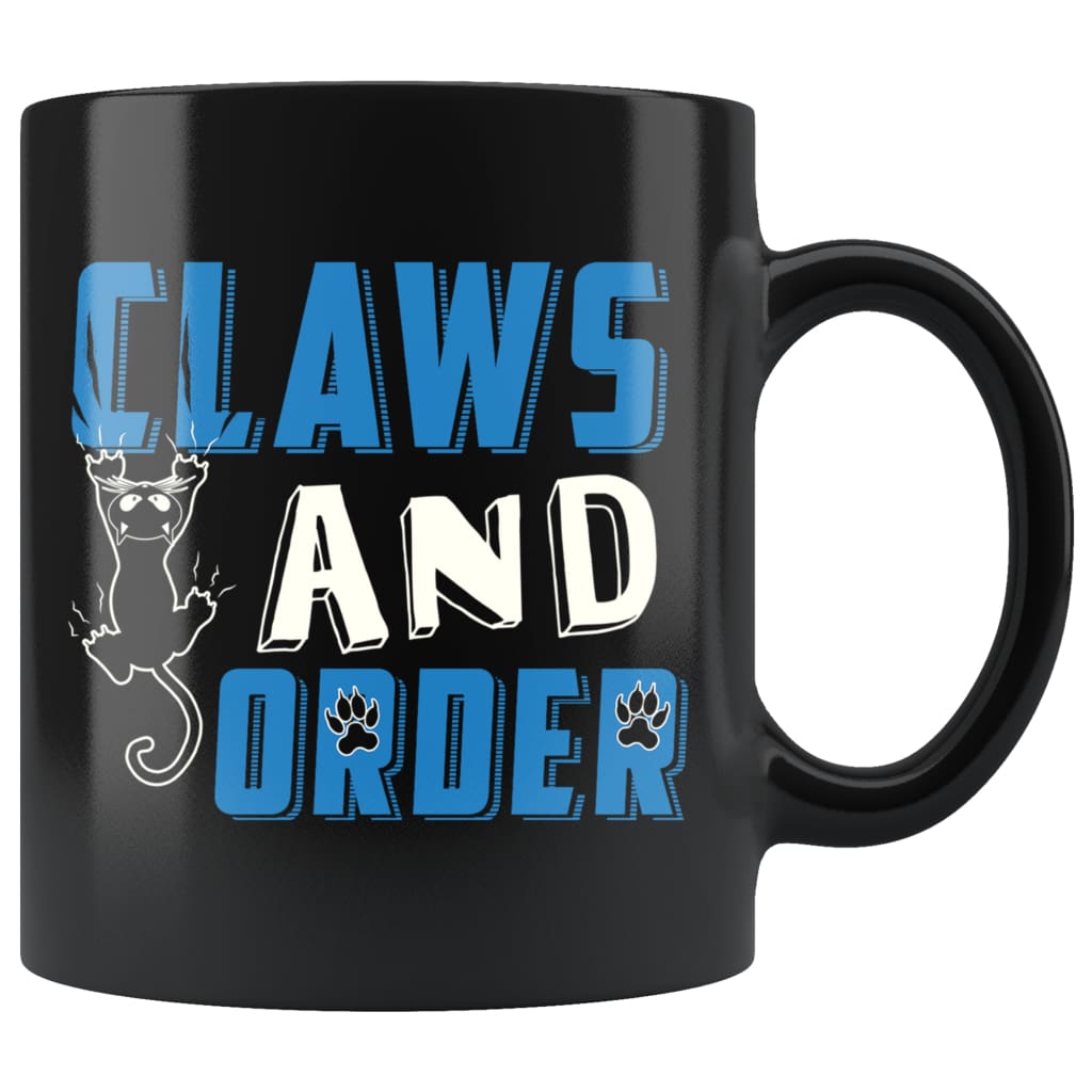 Funny Cat Mug text states Claws And Order.This high quality 11oz. ceramic black mug has a premium hard coat providing a crisp and vibrant color reproduction that will last for years. With a high gloss premium black finish...