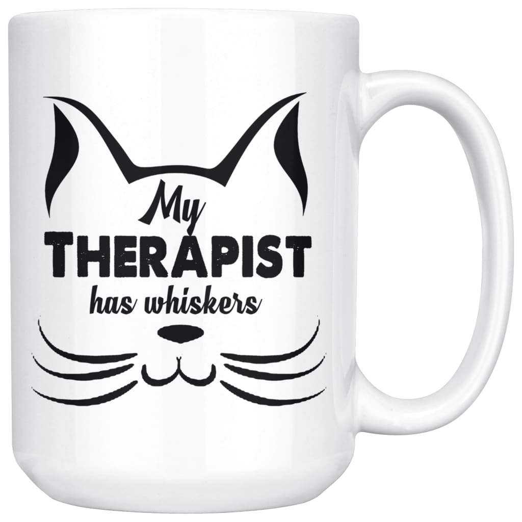 Funny Cat Mug states My Therapist Has Whiskers.This high quality 15oz. ceramic mug has a premium hard coat that provides crisp and vibrant color reproduction that will last for years. With a high gloss premium white...