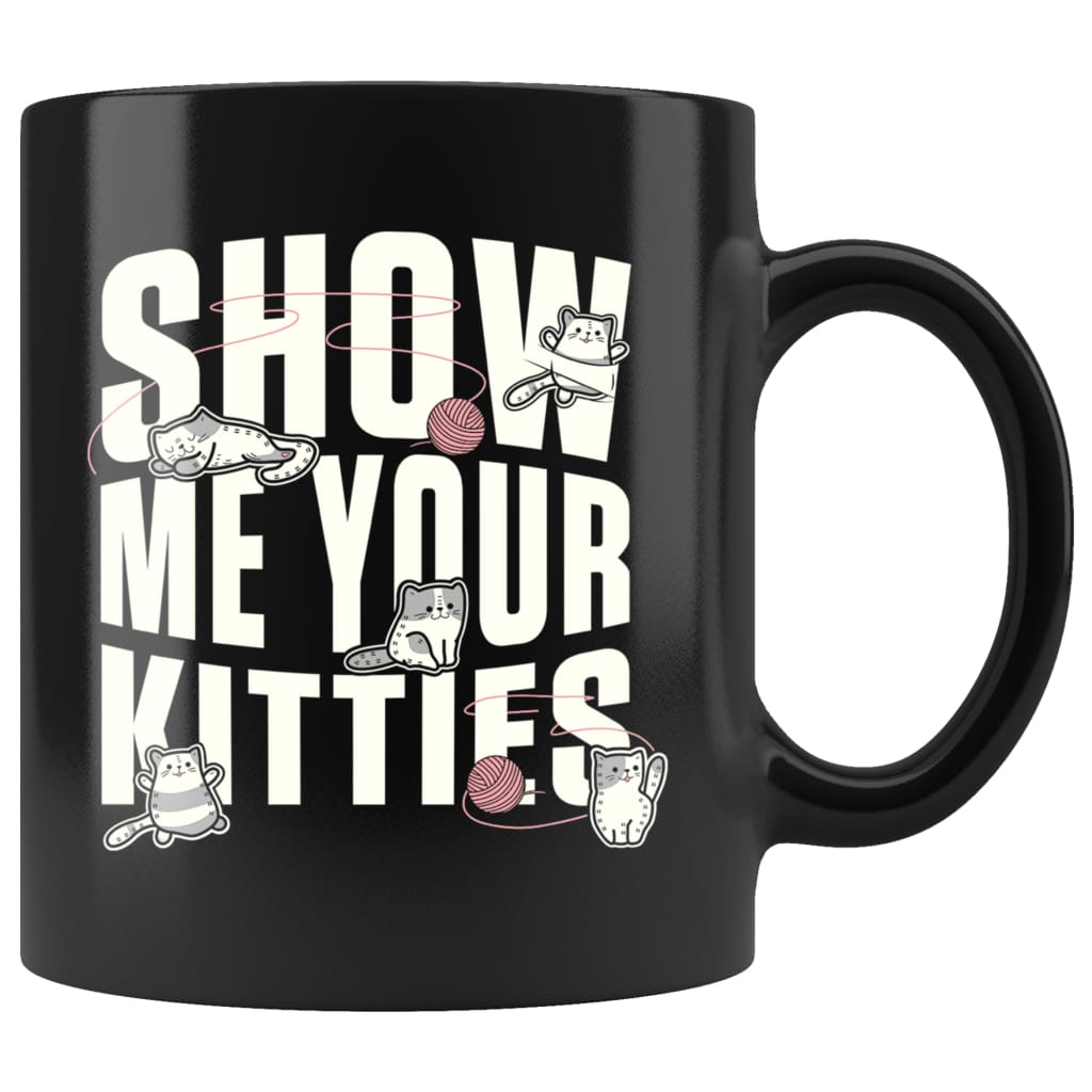 Funny Cat Mug states Show Me Your Kitties.This high quality 11oz. ceramic black mug has a premium hard coat providing a crisp and vibrant color reproduction that will last for years. With a high gloss premium black...