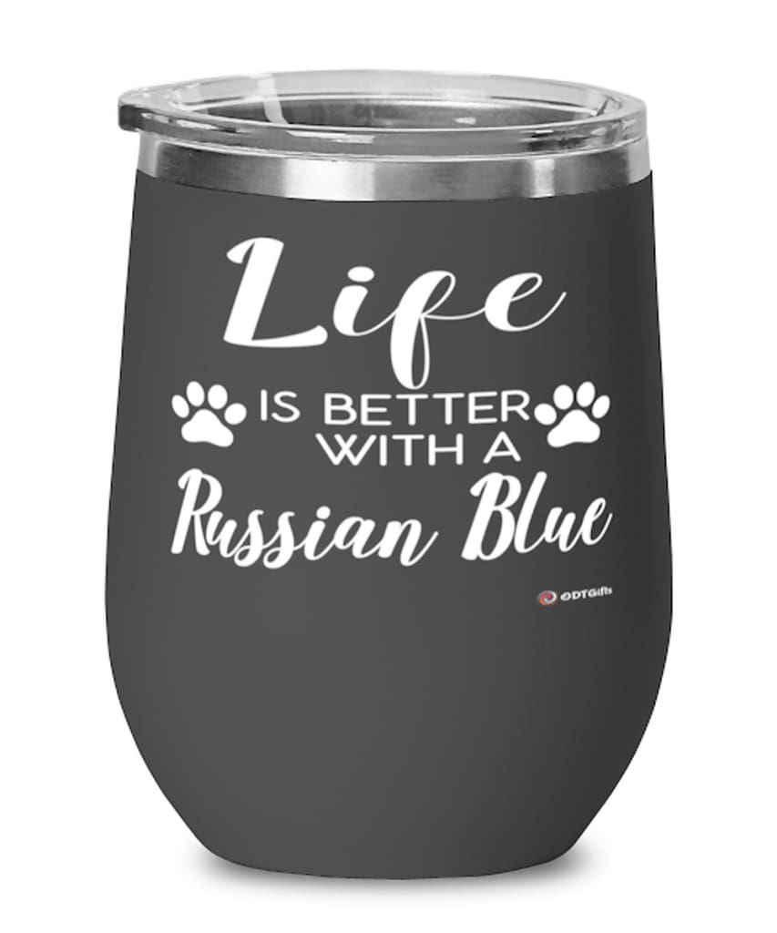 A beautiful stainless steel powder-coated stemless wine glass with a lid for Russian Blue. It's the perfect gift for wine drinkers! This wine tumbler has a double-wall vacuum insulated for hot and cold liquids, and we...