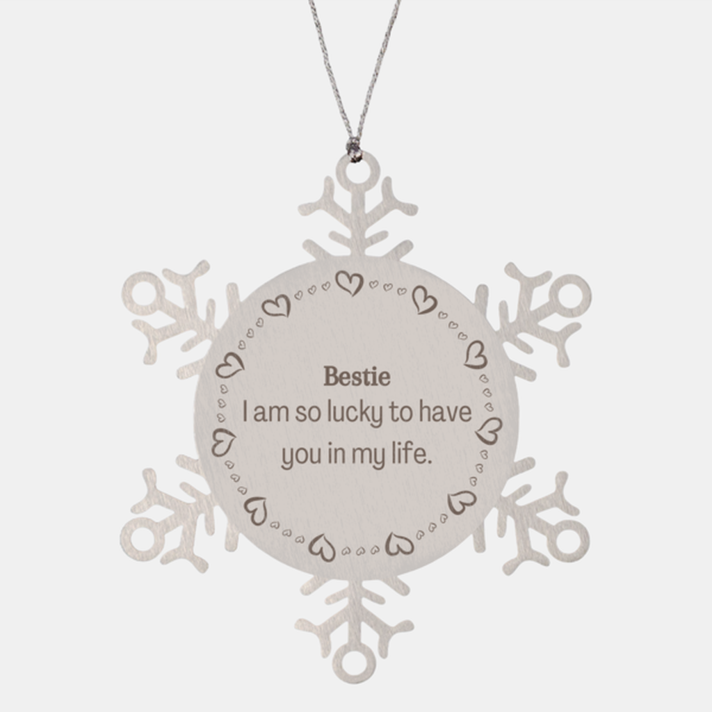 Drape this exquisite Bestie Snowflake Ornament on your tree and watch as it shimmers and sparkles, creating a magical ambiance in your home. Made from high-quality stainless steel, it's not only a symbol of beauty but also durability. Even in the unfortunate event of a fall from the tree, it remains shatterproof, ensuring that your treasured ornament will last for generations.