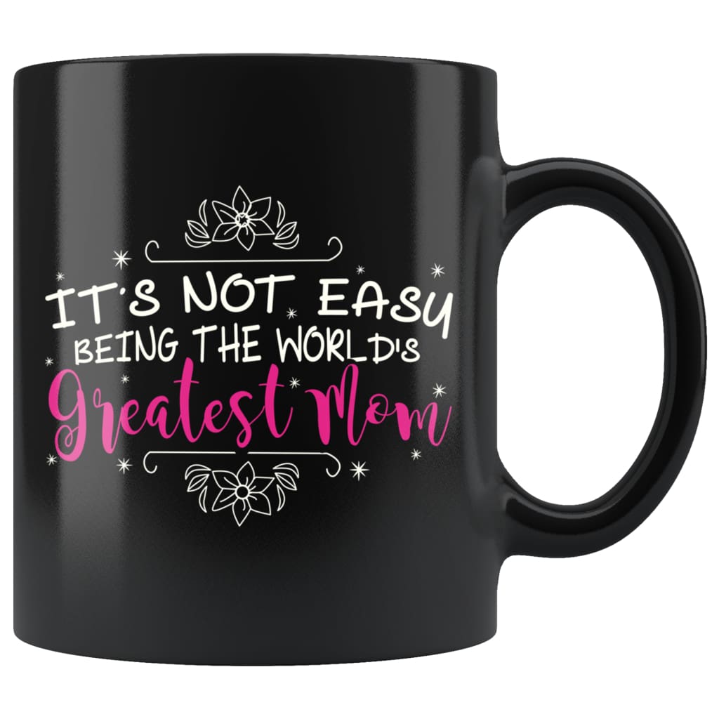 Mug text states It's Not Easy Being The Worlds Greatest Mom. This high quality 11oz. ceramic black mug has a premium hard coat providing a crisp and vibrant color reproduction that will last for years. With...