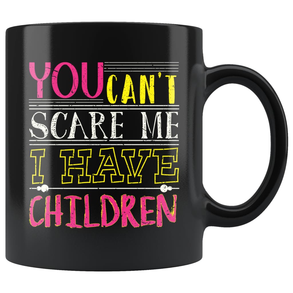 Funny Mom Mug text states You Can't Scare Me I Have Children.This high quality 11oz. ceramic black mug has a premium hard coat providing a crisp and vibrant color reproduction that will last for years. With a...