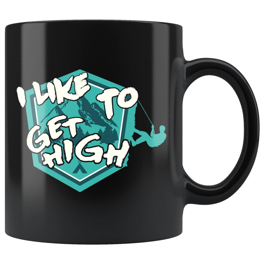 Funny Mountain Climber Mug text states I Like To Get High.This high quality 11oz. ceramic black mug has a premium hard coat providing a crisp and vibrant color reproduction that will last for years. With a high...