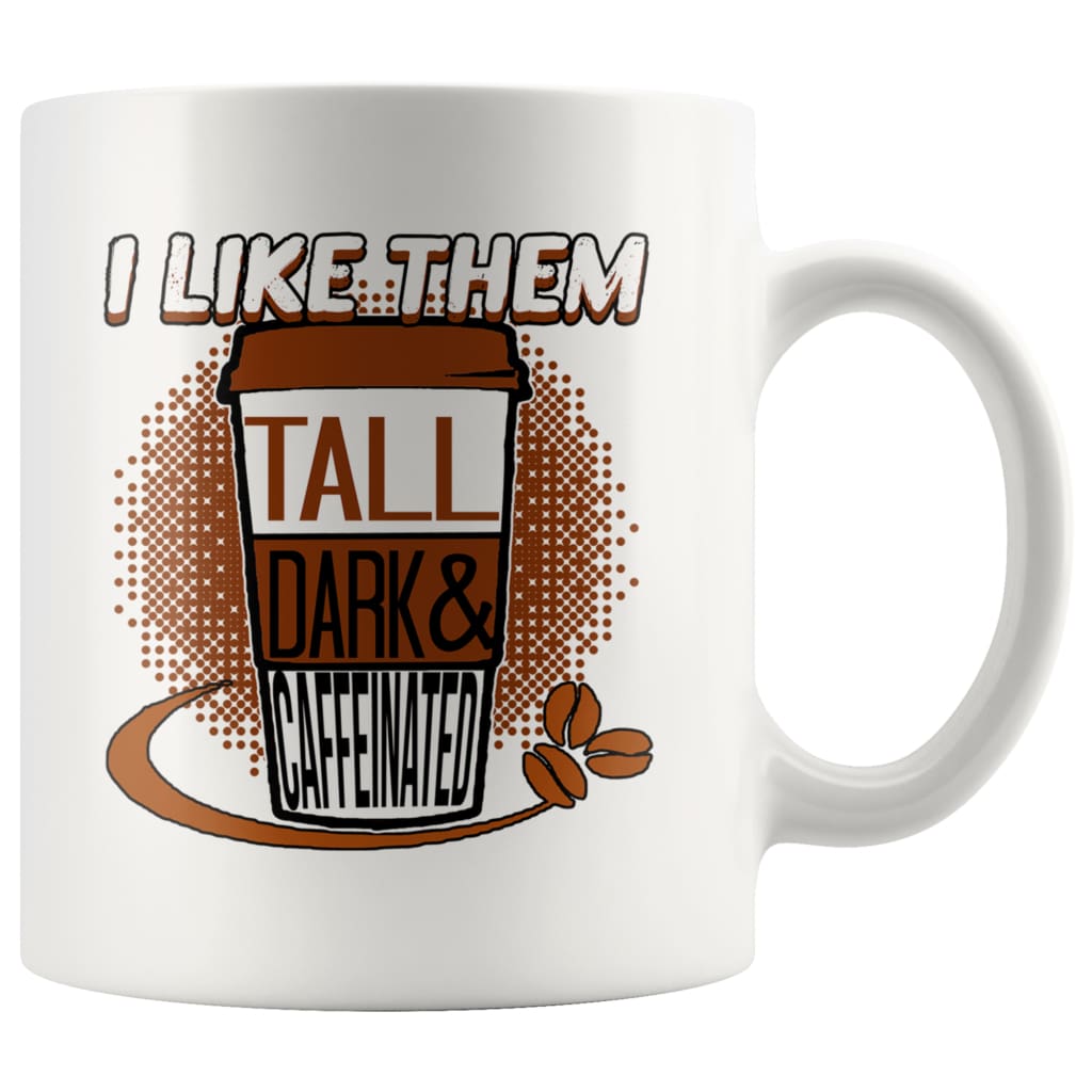 Funny Coffee Mug states I Like Them Tall Dark And Caffeinated.This high quality 11oz. ceramic white mug has a premium hard coat providing a crisp and vibrant color reproduction that will last for years. With a high gloss...