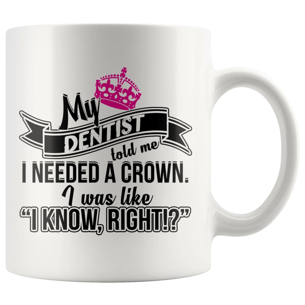 Funny Coffee Mug states My Dentist Told Me I Needed A Crown. I Was Like "I Know, Right?"This high quality 11oz. ceramic white mug has a premium hard coat providing a crisp and vibrant color reproduction that...