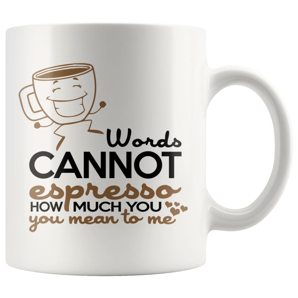 Funny Coffee Mug states Words Cannot Espresso How Much You Mean To Me.This high quality 11oz. ceramic white mug has a premium hard coat providing a crisp and vibrant color reproduction that will last for years....