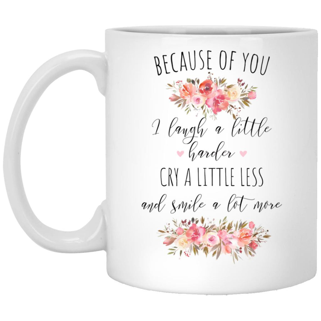 Cute Bestfriend Mug Because Of You I Laugh Harder Cry Less Smile More Coffee Cup 11oz White High quality white gloss 11oz ceramic mug Dishwasher safe & Microwave safe Top-to-bottom full wrap dye sublimation AAA Orca...