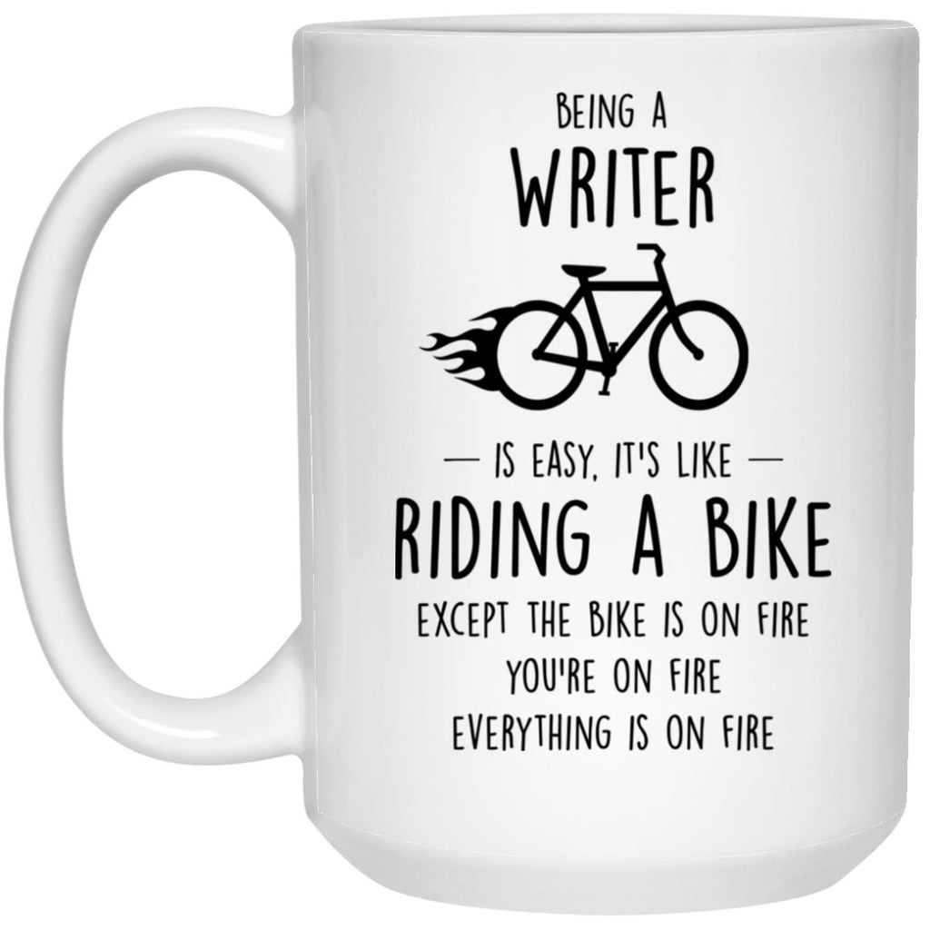 Funny Being A Writer Is Easy It's Like Riding A Bike Except Coffee Cup 15oz White High quality 15oz white gloss ceramic mug Decorated with full wrap dye sublimation Microwave & Dishwasher safe AAA ORCA Coating™...
