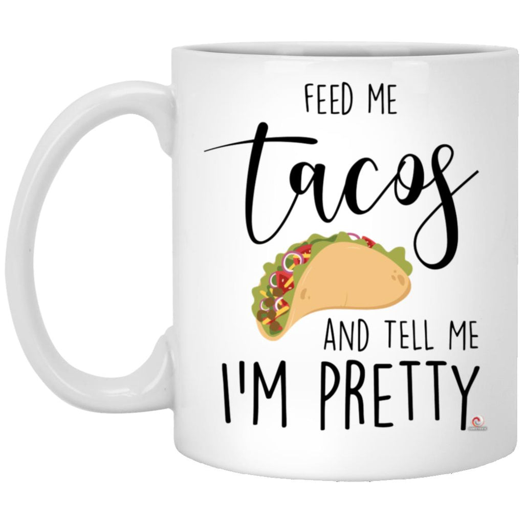 Funny Couples Relationship Mug Feed Me Tacos And Tell Me I'm Pretty Coffee Cup 11oz White High quality white gloss 11oz ceramic mug Dishwasher safe & Microwave safe Top-to-bottom full wrap dye sublimation AAA ORCA Coating™...