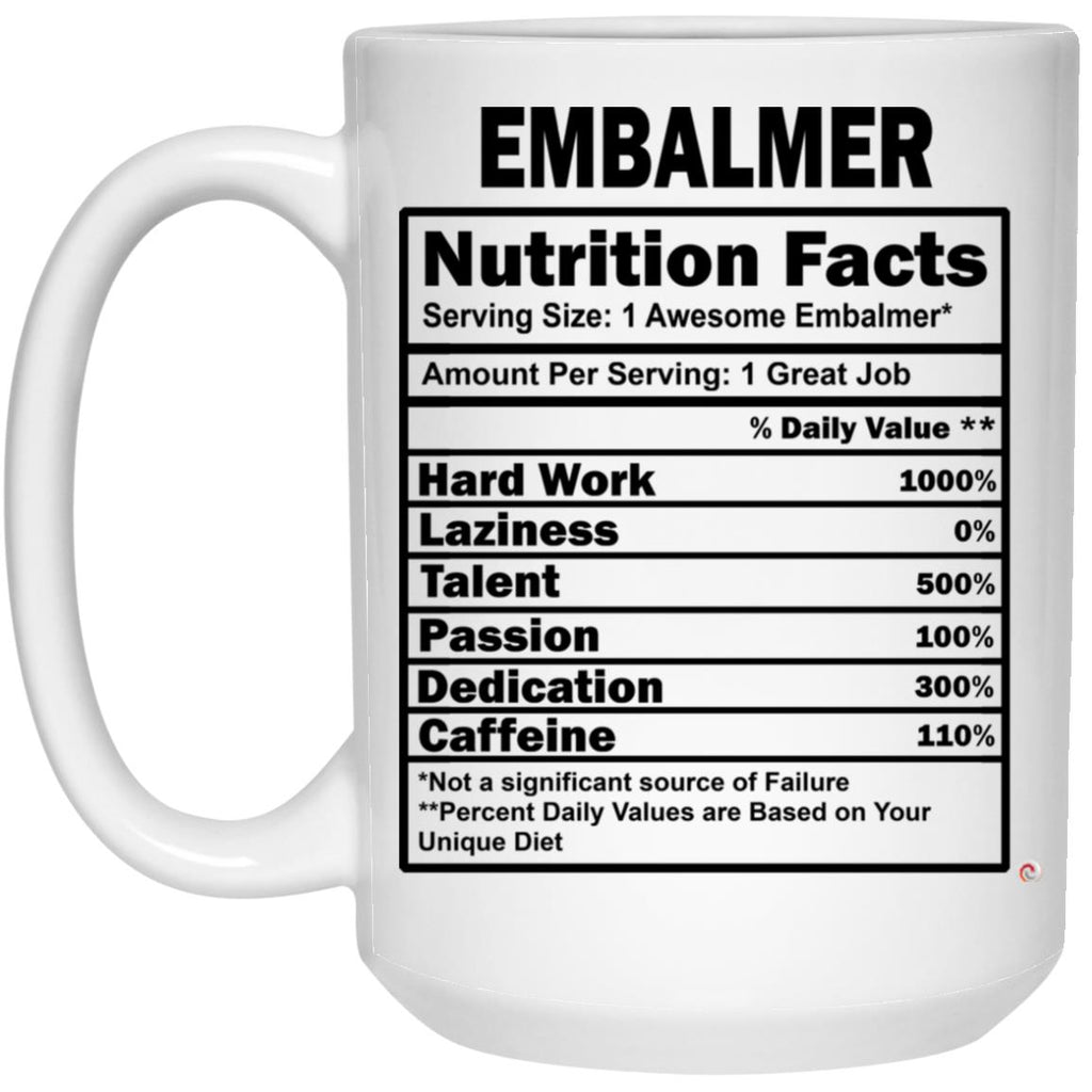 Funny Embalmer Mug Embalmer Nutrition Facts Coffee Cup 15oz White  High quality 15oz white gloss ceramic mug Decorated with full wrap dye sublimation Microwave & Dishwasher safe AAA ORCA Coating™ for maximum print vibrancy Decoration Type:...