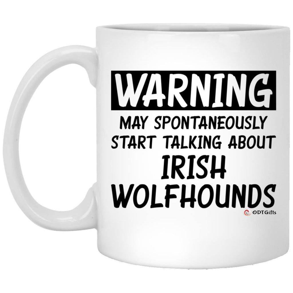 Funny Irish Wolfhound Mug Warning May Spontaneously Start Talking About Irish Wolfhounds Coffee Cup 11oz White  High quality white gloss 11oz ceramic mug Dishwasher safe & Microwave safe Top-to-bottom full wrap dye sublimation AAA ORCA Coating™...