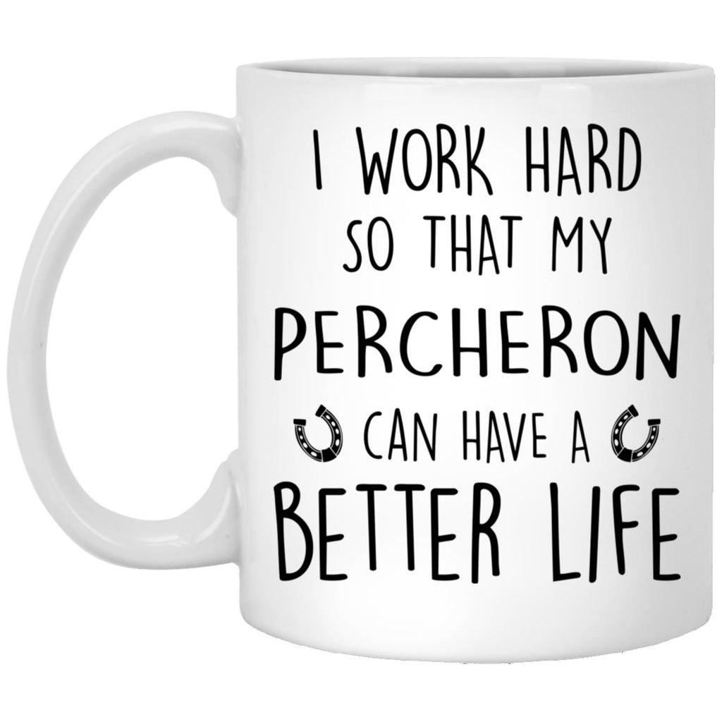 Funny Percheron Mug I Work Hard So That My Percheron Can Have A Better Life Coffee Cup 11oz White High quality white gloss 11oz ceramic mug Dishwasher safe & Microwave safe Top-to-bottom full wrap dye sublimation...