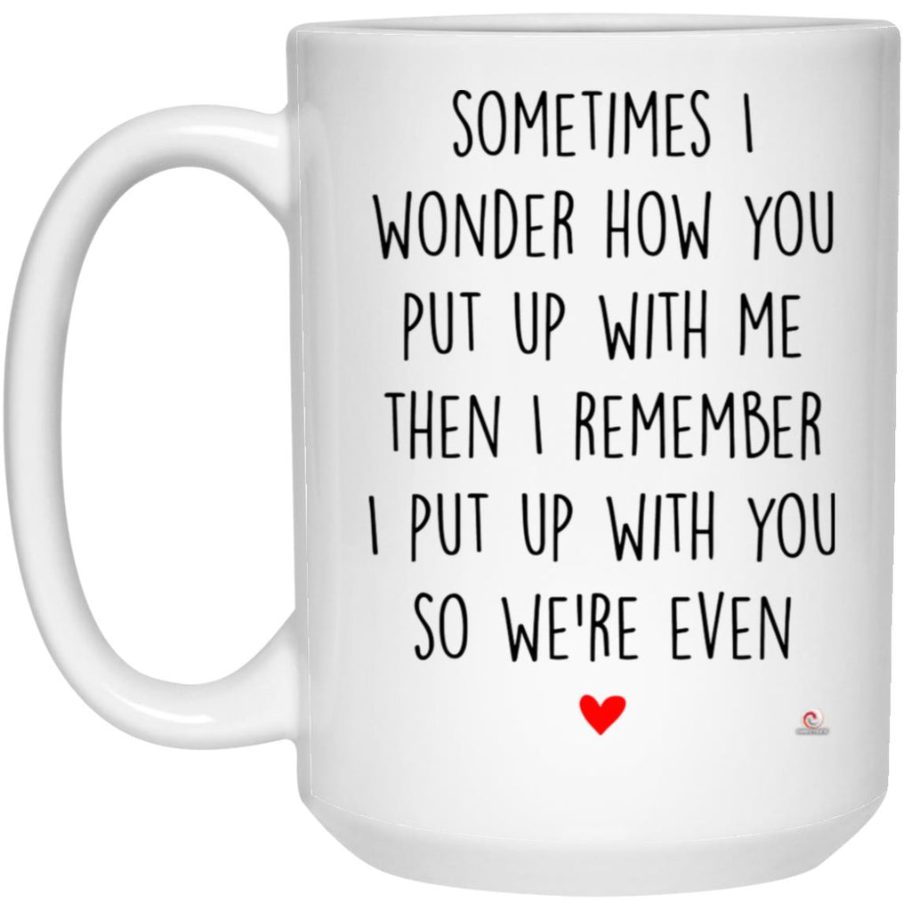 Funny Relationship Mug Sometimes I Wonder How You Put Up With Me Coffee Cup 15oz White High quality 15oz white gloss ceramic mug Decorated with full wrap dye sublimation Microwave & Dishwasher safe AAA ORCA Coating™...