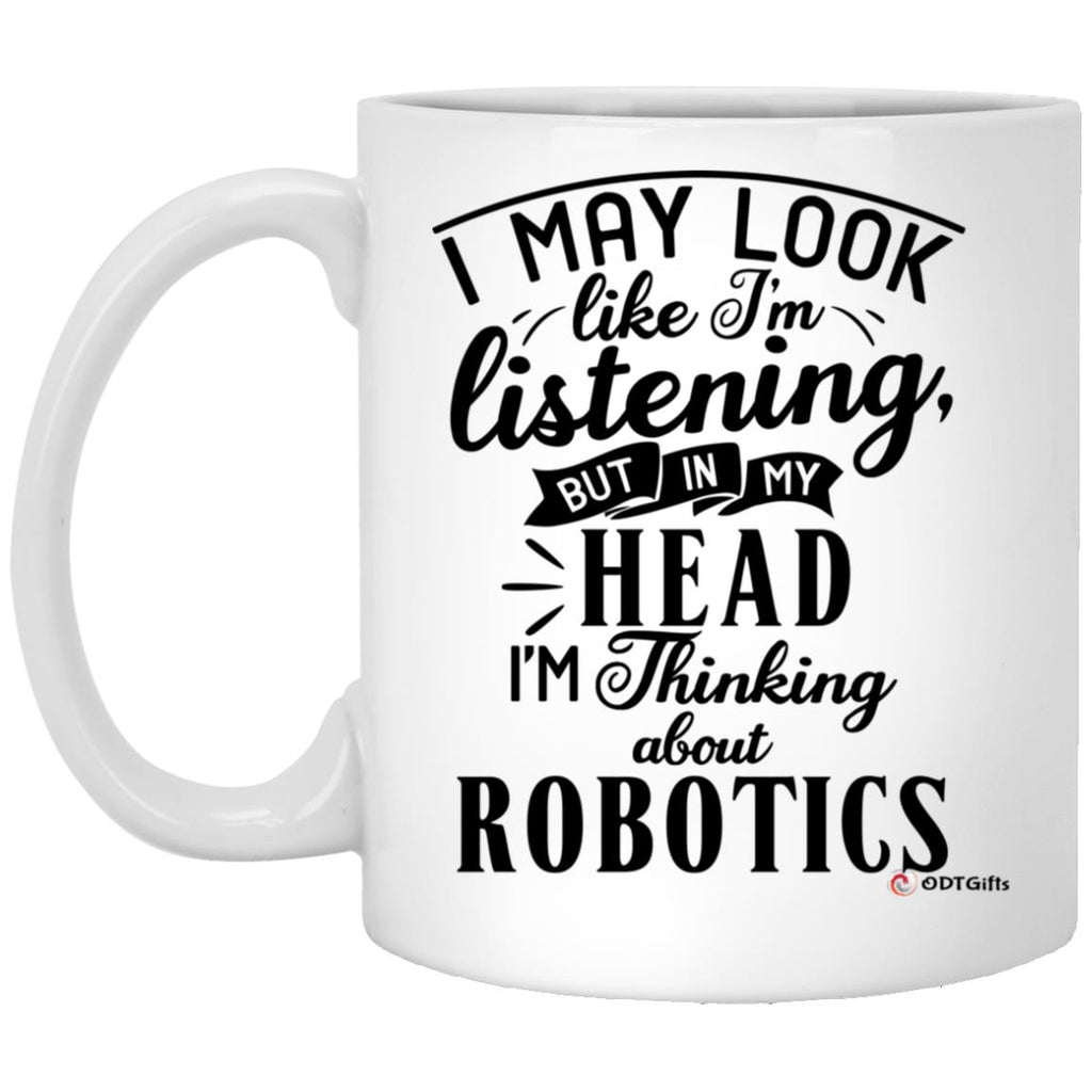 Funny Robotics Mug I May Look Like I'm Listening But In My Head I'm Thinking About Robotics Coffee Cup 11oz White High quality ceramic mug Dishwasher safe Microwave safe White gloss 11 oz Decorated with full...