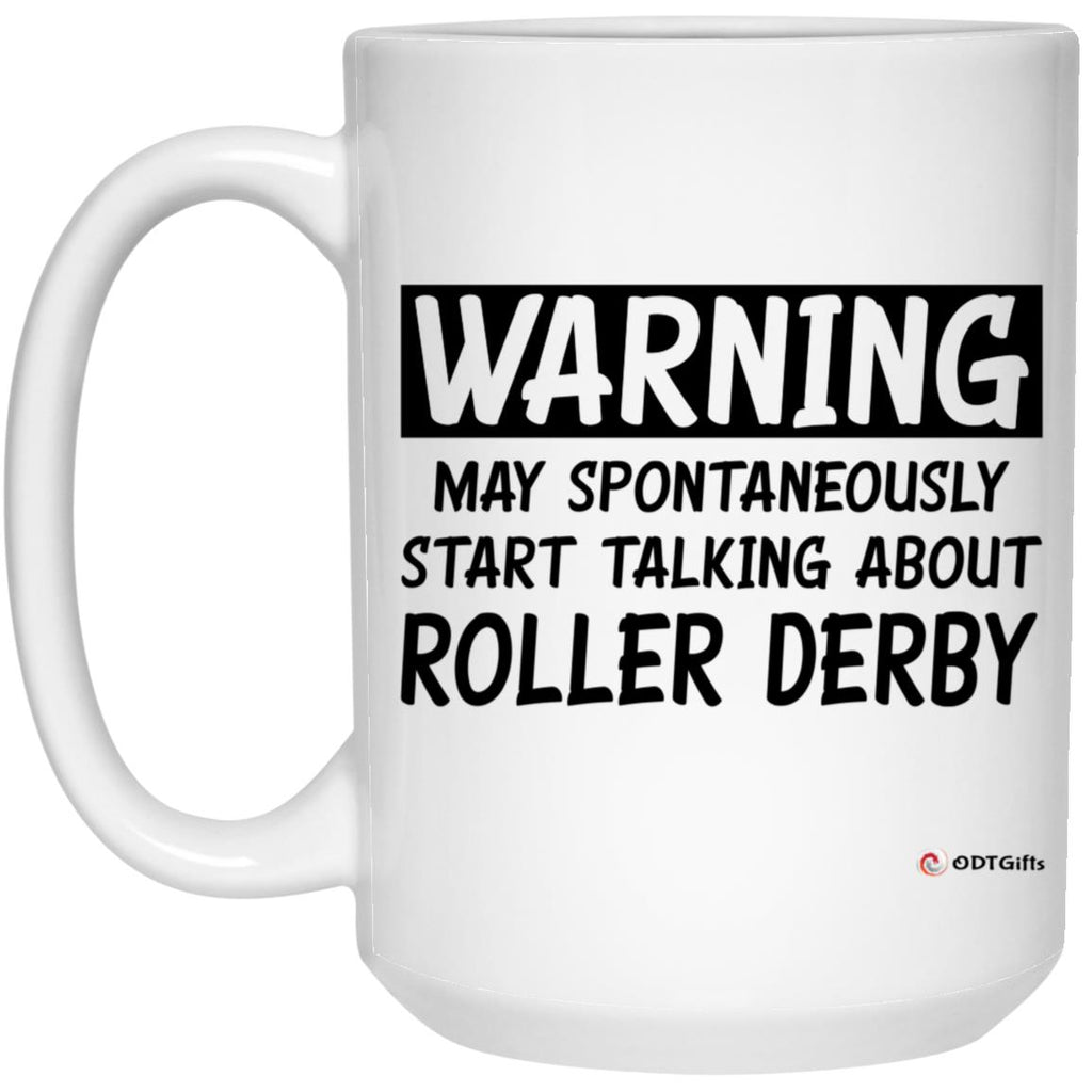 Funny Roller Derby Mug Warning May Spontaneously Start Talking About Roller Derby Coffee Cup 15oz White High quality 15oz white gloss ceramic mug Decorated with full wrap dye sublimation Microwave & Dishwasher safe AAA ORCA Coating™...