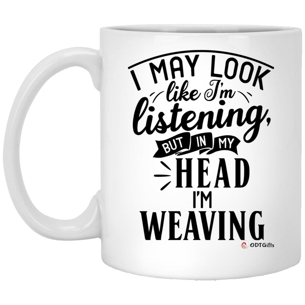 Funny Weaving Mug I May Look Like I'm Listening But In My Head I'm Weaving Coffee Cup 11oz White High quality white gloss 11oz ceramic mug Dishwasher safe & Microwave safe Top-to-bottom full wrap dye sublimation...