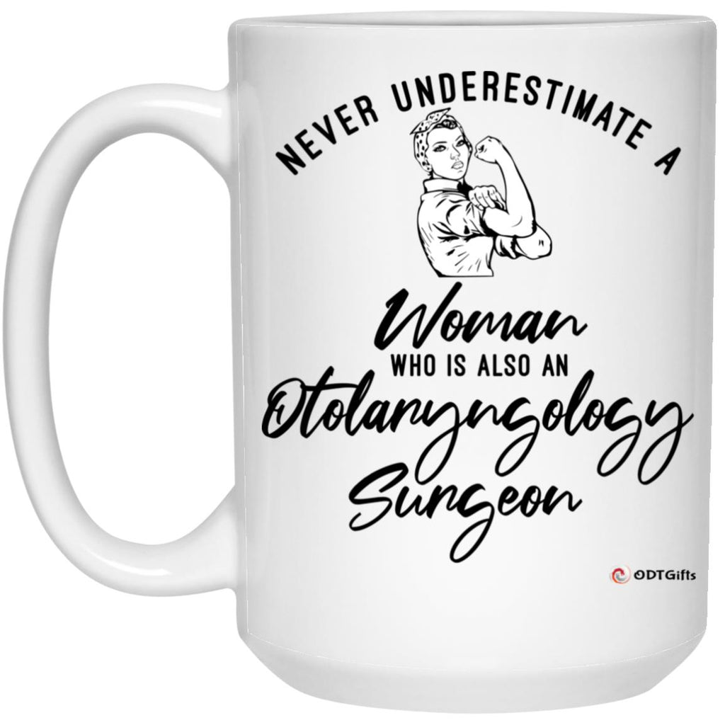 Otolaryngology Surgeon Mug Never Underestimate A Woman Who Is Also An Otolaryngology Surgeon Coffee Cup 15oz White High quality 15oz white gloss ceramic mug Top to bottom full wrap decoration Microwave & Dishwasher safe ORCA...