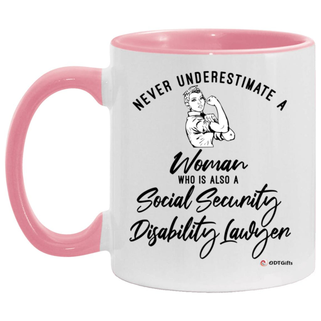 Social Security Disability Lawyer Mug Never Underestimate A Woman Who Is Also A Social Security Disability Lawyer Coffee Cup Two Tone Pink 11oz  High quality ceramic mug with two-tone rim, interior, & handle Top to bottom...