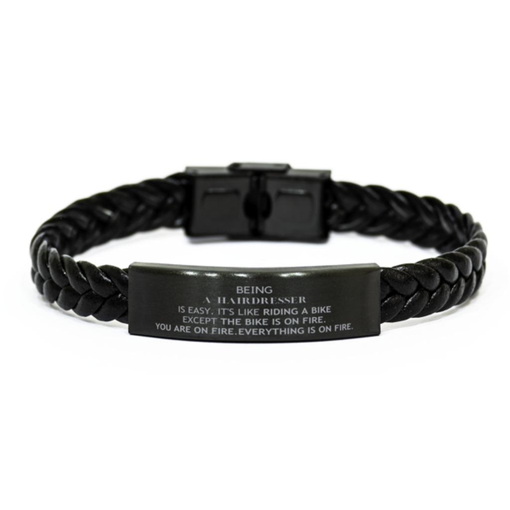 Sarcastic Hairdresser Gifts, Birthday Christmas Unique Braided Leather Bracelet For Hairdresser for Coworkers, Men, Women, Friends Being Hairdresser is Easy. It's Like Riding A Bike Except The Bike Is On Fire. You Are On Fire. Everything Is On Fire