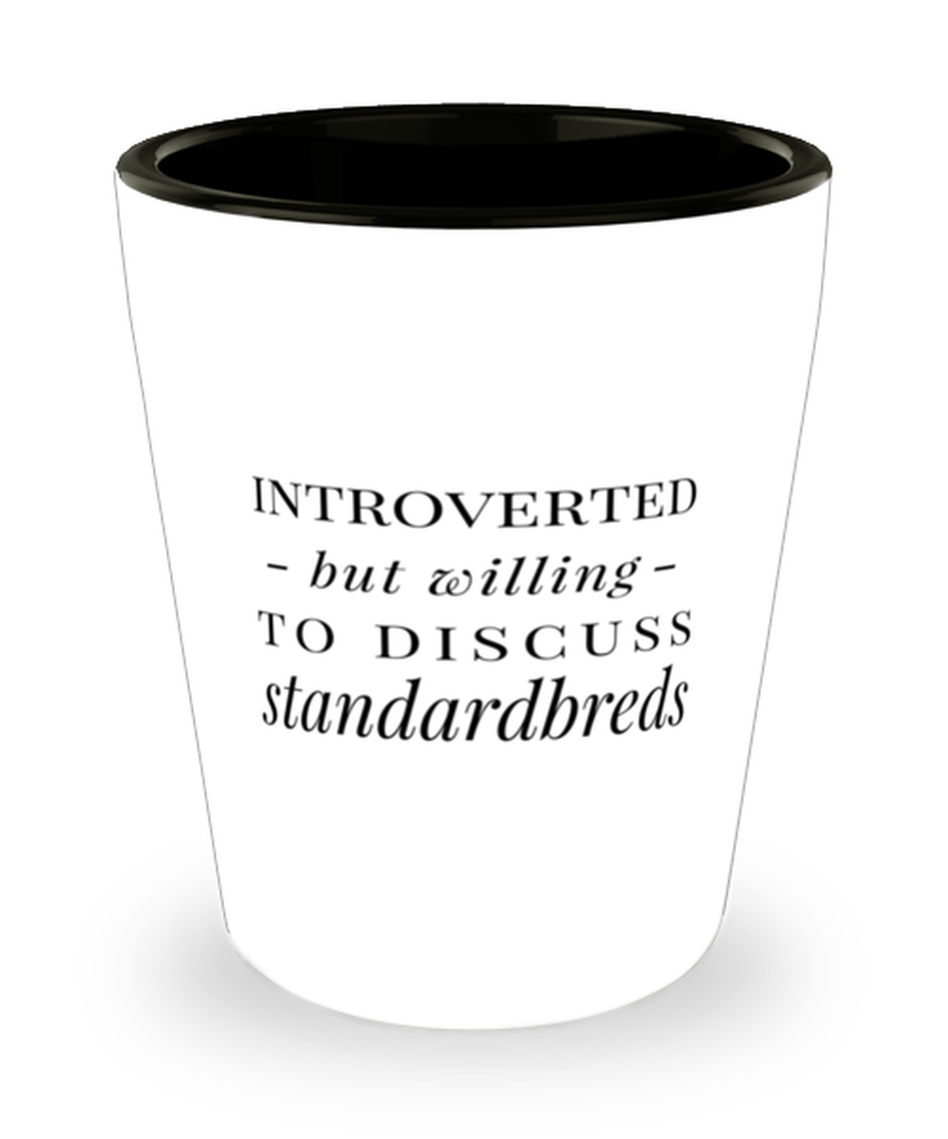 - Stylish 1.5 ounce Standardbreds shot glass with a sleek white exterior and contrasting black interior