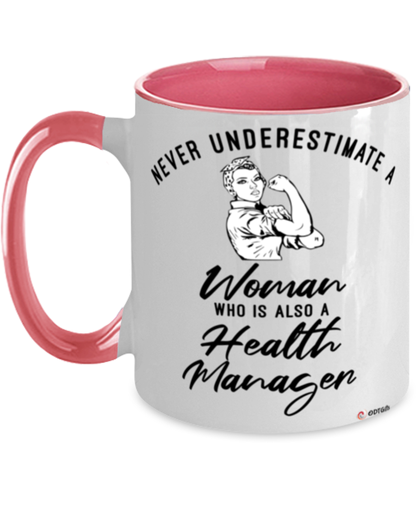 Health Manager Mug Never Underestimate A Woman Who Is Also A Health Manager Coffee Cup Two Tone Pink 11oz