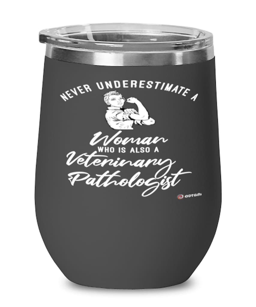 Veterinary Pathologist Wine Glass Never Underestimate A Woman Who Is Also A Veterinary Pathologist 12oz Stainless Steel Black