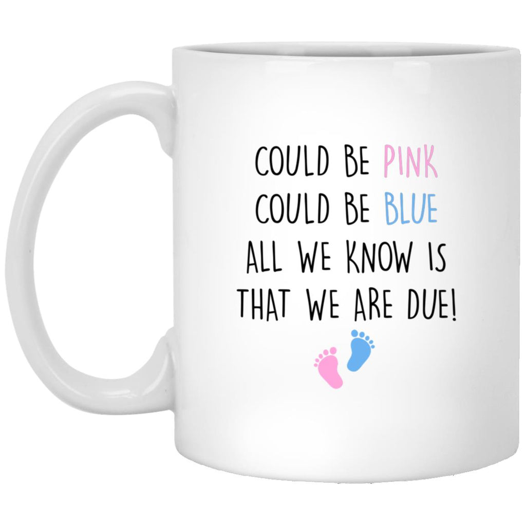 ODDITEES Pregnancy Announcement Could Be Pink Blue All We Know Is We Are Due Coffee Cup 11oz White    High quality white gloss 11oz ceramic mug Dishwasher safe & Microwave safe Top-to-bottom full wrap dye sublimation...