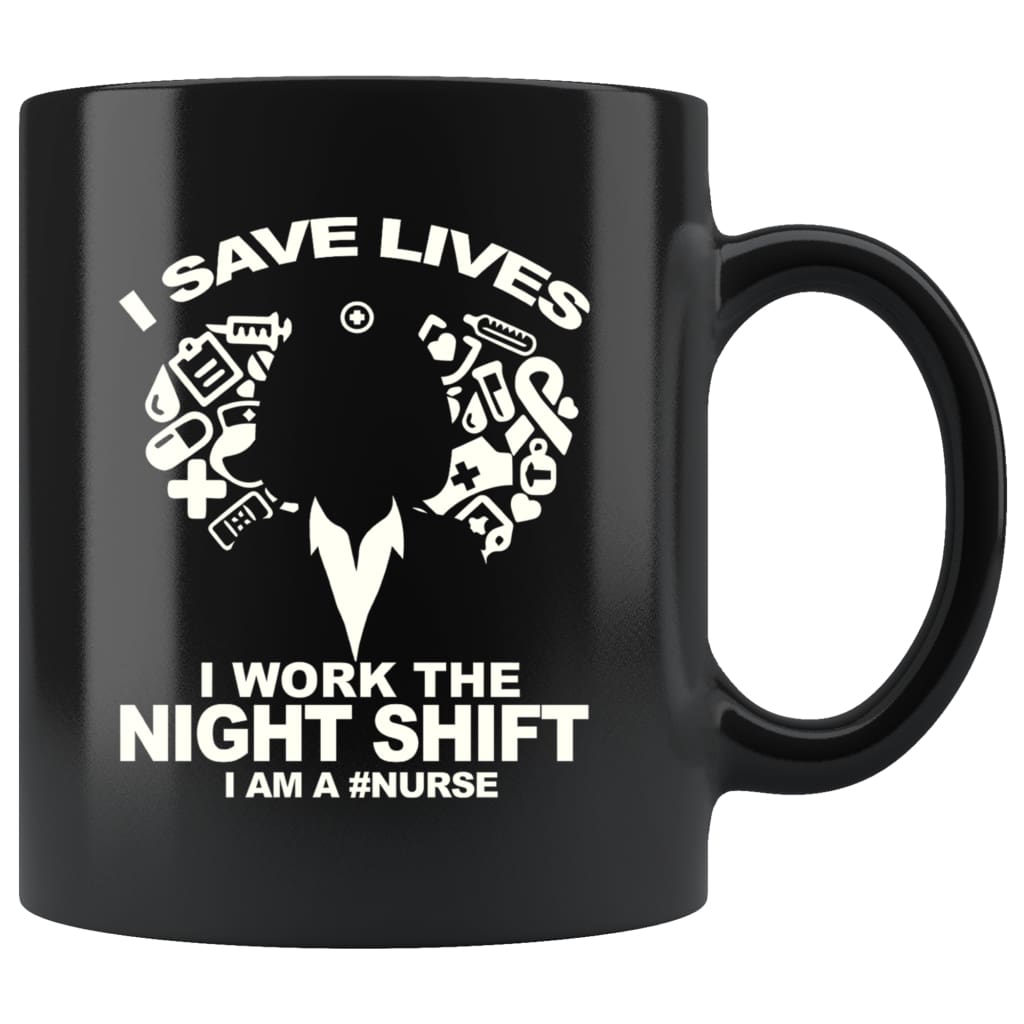 Nursing Mug text states I Save Lives I Work The Night Shift I'm A Nurse.This high quality 11oz. ceramic black mug has a premium hard coat providing a crisp and vibrant color reproduction that will last...
