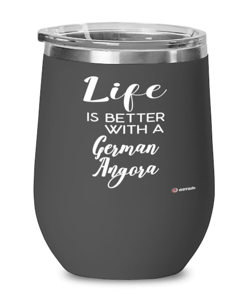 A beautiful stainless steel powder-coated stemless wine glass with a lid for German Angora. It's the perfect gift for wine drinkers! This wine tumbler has a double-wall vacuum insulated for hot and cold liquids, and we...