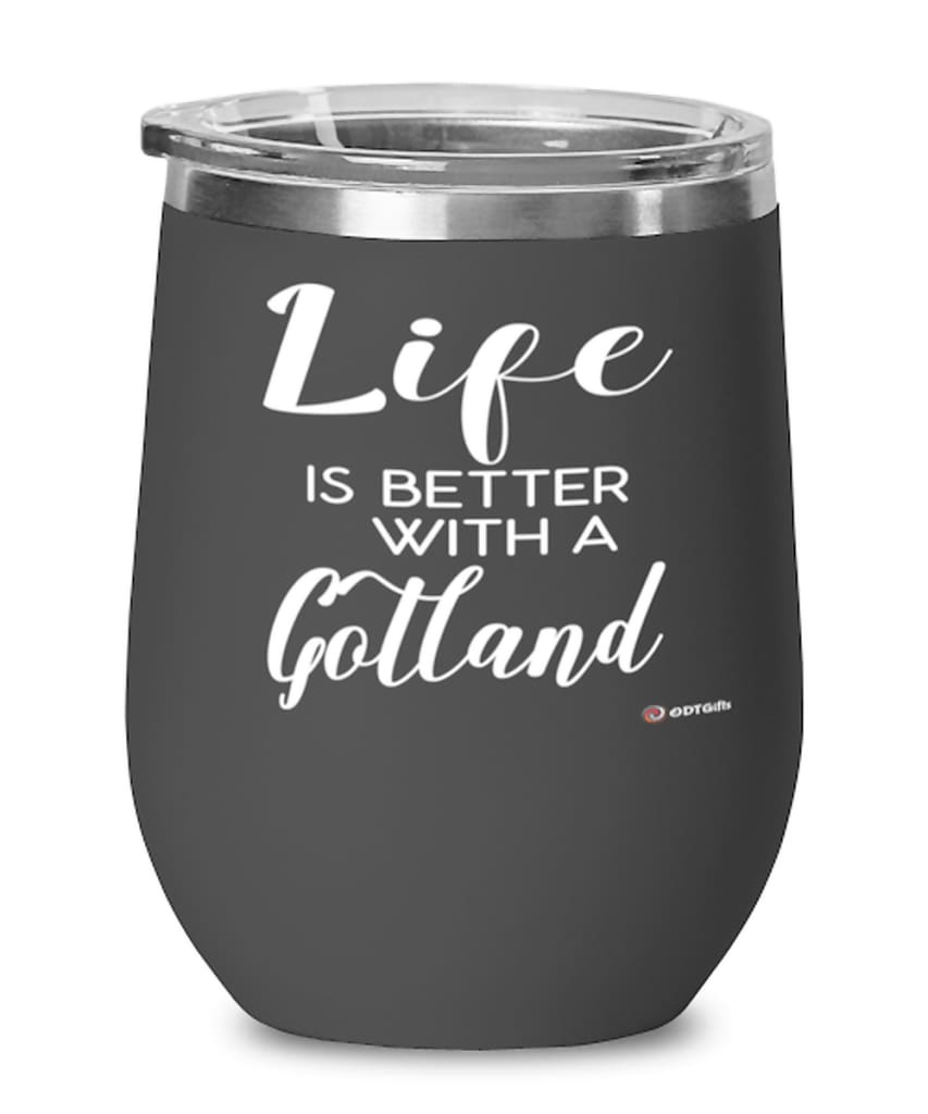 A beautiful stainless steel powder-coated stemless wine glass with a lid for Gotland. It's the perfect gift for wine drinkers! This wine tumbler has a double-wall vacuum insulated for hot and cold liquids, and we engrave each tumbler with top-of-the-line laser technology to ensure precise design and durability. These are perfect party favors for your next event, wedding, family reunion, pool party, picnic, BBQ's, baby shower, birthday, and so much more. Hand wash only, not dishwasher or microwave safe.