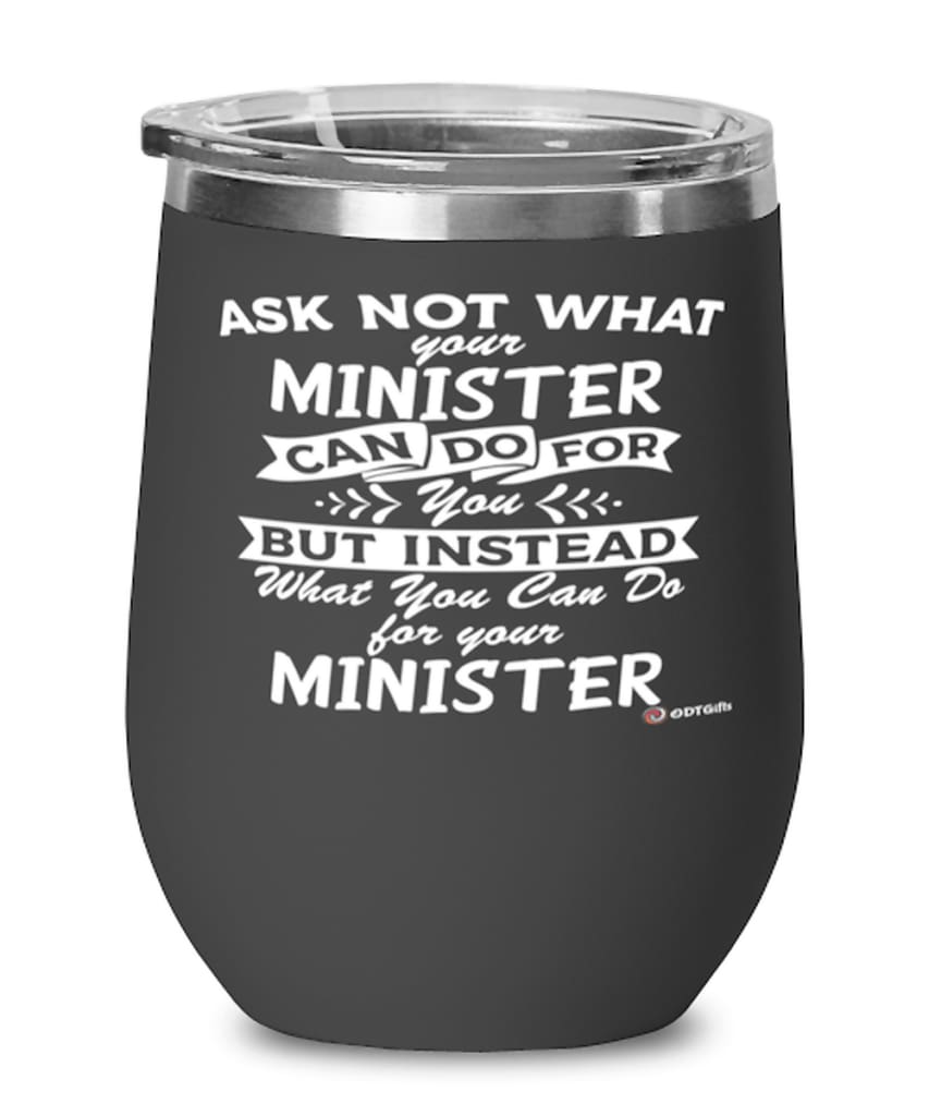 A beautiful stainless steel powder-coated stemless wine glass with a lid for Minister. It's the perfect gift for wine drinkers! This wine tumbler has a double-wall vacuum insulated for hot and cold liquids, and we engrave each tumbler with top-of-the-line laser technology to ensure precise design and durability. These are perfect party favors for your next event, wedding, family reunion, pool party, picnic, BBQ's, baby shower, birthday, and so much more. Hand wash only, not dishwasher or microwave safe.